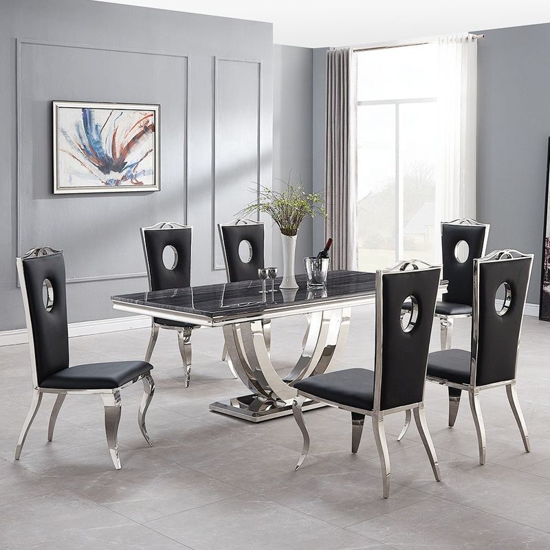 De SEDIA A166 Luxury Eating Table Sets bieden een elegante look die indruk zal maken op uw gasten.Het marmeren tafelblad voegt een vleugje verfijning toe en de tafelbenen van roestvrij staal zorgen voor een moderne draaiCreëer een luxe eetbeleving met deze stijlvolle eettafel sets.