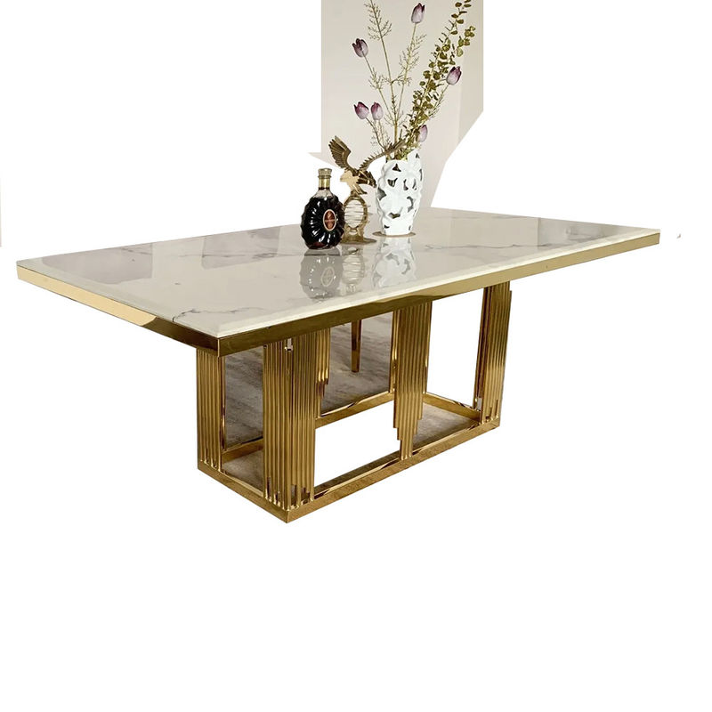 Kortom, onze Appartement Eettafels zijn een harmonieuze mix van luxe en praktijk, ontworpen om te voldoen aan de behoeften van moderne woonruimten.De combinatie van een prachtige marmeren top en stevige roestvrijstalen benen biedt zowel esthetische aantrekkingskracht als functionaliteitOf u nu een huis, herberg of hotel wilt inrichten, onze eettafels zullen zeker een vleugje klasse en verfijning toevoegen aan uw eettafel.Maar het eindresultaat is een eetruimte waar je trots op kunt zijn., een die een gevoel van luxe, stabiliteit en tijdloze stijl weerspiegelt.