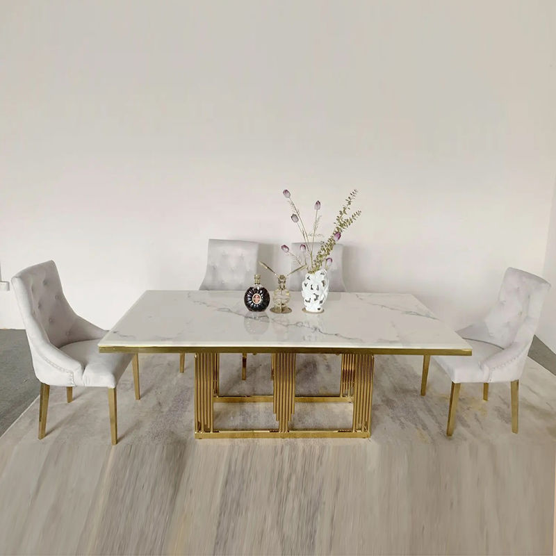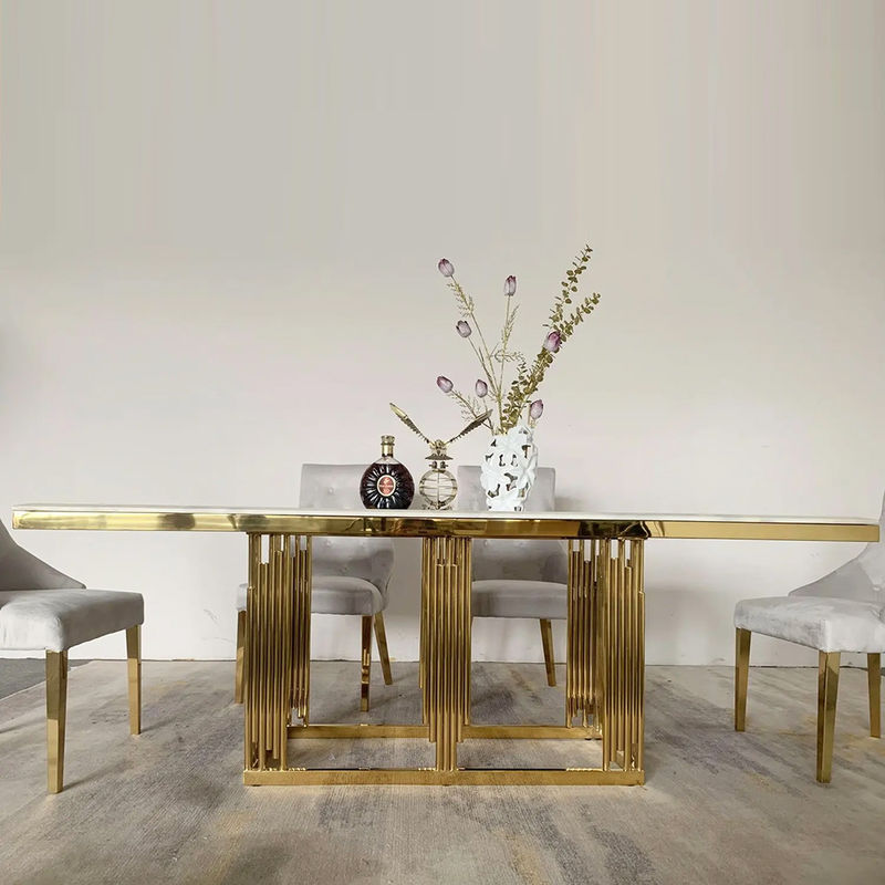 Het luxe marmeren dak wordt ondersteund door robuuste tafelbenen van hoogwaardig roestvrij staal.Deze benen zorgen voor de kracht en stabiliteit die nodig zijn om het marmeren dak en de dagelijkse activiteiten rond een eettafel te ondersteunenRoestvrij staal is niet alleen sterk, maar ook bestand tegen roest en corrosie, waardoor het een ideaal materiaal is voor de stevige benen van onze tafels.Het slanke ontwerp van de benen vormt een aanvulling op het marmeren dak en draagt bij aan de moderne esthetiek van de tafel, waardoor het een veelzijdig stuk is dat past bij een breed scala aan interieurstijlen.